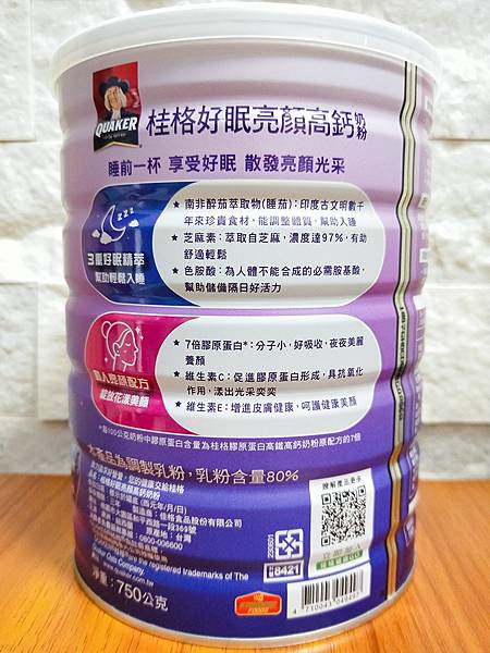 另一側可以清楚看到詳細成分內容,而色胺酸、芝麻素已經不陌生,所以我看到一個很特別的成分-南非醉茄萃取物(睡茄),這名字取得真是簡單明瞭,能調節生理機能、幫助入睡,自然白天就能精力充沛,提升工作表現;選擇桂格好眠亮顏高鈣奶粉還有一個原因,就是額外添加亮顏配方-膠原蛋白,小分子好吸收,還有維生素C、維生素E,讓忙碌的現代人可以在睡前喝一杯,除了舒適輕鬆、幫助入睡,還能夠亮顏,真是一舉兩得!![]()
