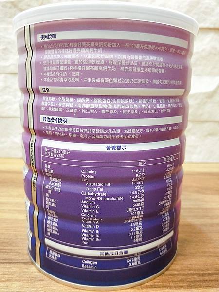 最後看到營養標示,一杯只有118大卡,睡前1-2小時當宵夜喝也不會覺得有負擔,一杯210毫升桂格好眠亮顏高鈣奶粉,鈣794毫克、色胺酸159毫克、芝麻素13.6毫克、維生素C 54毫克、維生素E 8毫克α-TE、膠原蛋白1072毫克、鐵5毫克,除了3重好眠精萃配方,幫助入睡,還有高鈣、高鐵成分,幫助維持骨骼健康及紅潤好氣色。![]()