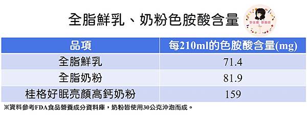 相信你一定有聽過睡前喝牛奶可以幫助睡眠,就是內含色胺酸的關係。於是我好奇查一下全脂鮮乳、全脂奶粉、市售睡眠相關奶粉的色胺酸含量: