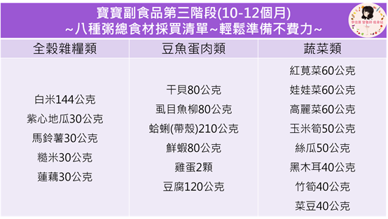 我一樣將八種粥規劃八天,非常適合忙碌的上班族爸媽,寶寶在四天內不會吃到重複的粥,胃口好,均衡攝取不同食材!