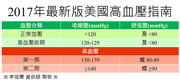 因為高血壓盛行率逐年攀升,於是美國心臟協會於2017年下修高血壓標準,可以看到以下表格: