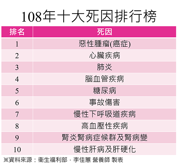 由以上案例可以知道一般人對於高血壓的輕忽,其實高血壓是沉默的殺手,有些人早期因沒有明顯症狀,甚至到了有併發症出現才發覺,心肌梗塞、腦中風、腎功能不全…等,也有可能是因為高血壓沒有適當治療所造成,看到以下108年十大死因表格,與高血壓相關疾病就佔了四項![]()