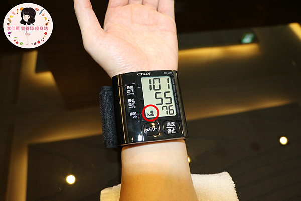 測量血壓如果講話、晃動,亦會造成血壓偏高、偏低,造成測量不準確,螢幕會顯示身體晃動標誌,可以看到以下圖片所示(紅圈),表示此次測量數值需要重新測量。