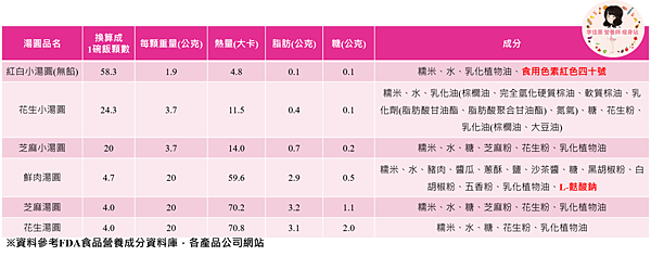 首先看到以上表格,市售常見湯圓分析,包餡大湯圓-芝麻湯圓、花生湯圓只要吃4顆就等於一碗飯,而包餡小湯圓-芝麻小湯圓、花生小湯圓則是20幾顆才等於一碗飯,對於想要減重又想吃湯圓的人,建議吃包餡小湯圓會比較好,因為視覺份量多,不容易攝取過量。