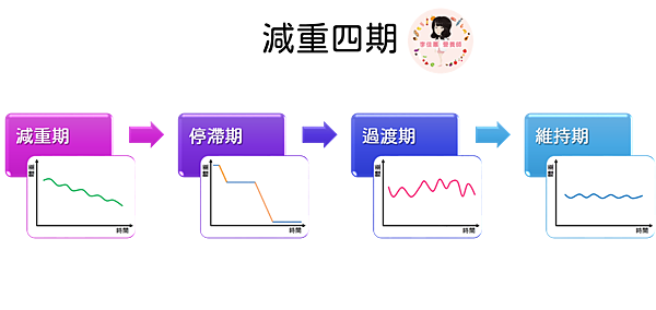 減重成功後,一定要維持一段時間,讓身體記憶,才可以將體重維持,看到以下圖片,減重可以簡單分成四期: